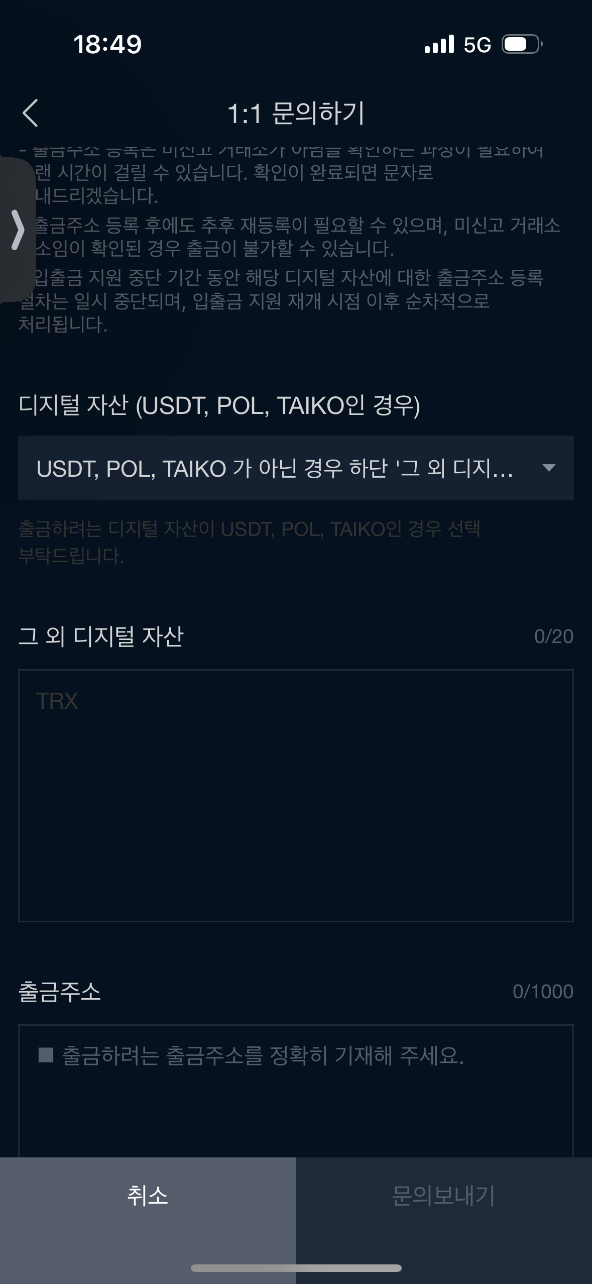 고객센터 - 1:1문의하기 - 일반 - 출금주소 등록 신청