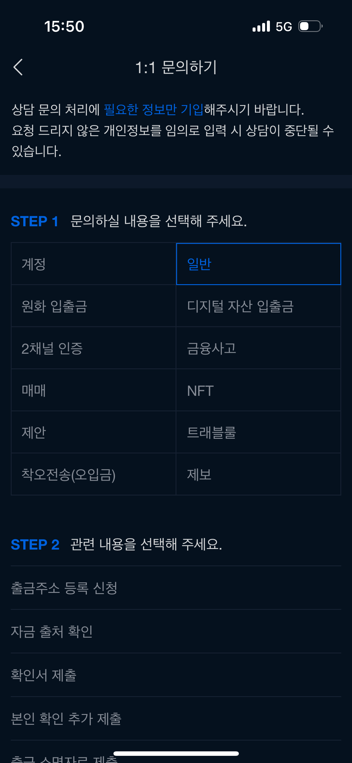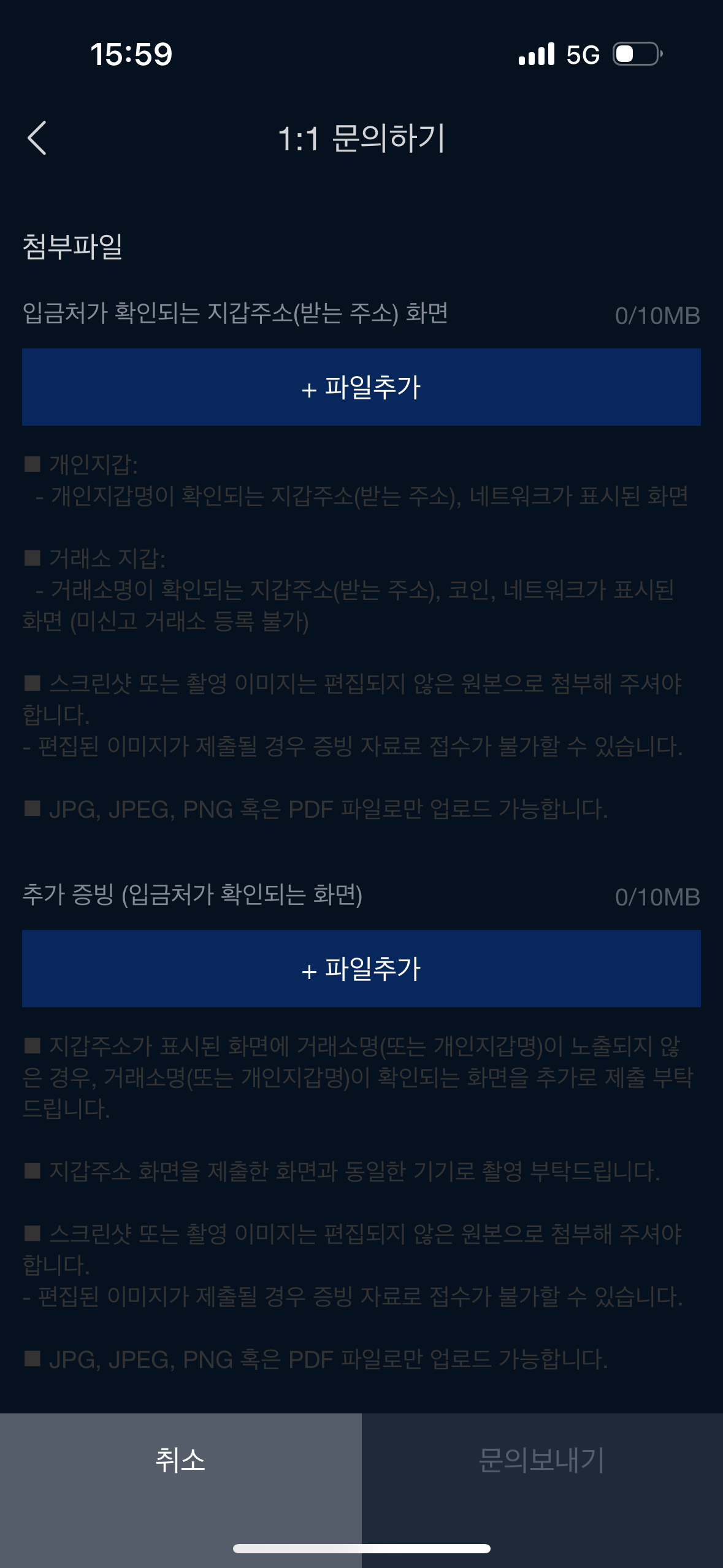 더보기 - 고객센터 - 1:1문의하기 - 일반 - 출금주소 등록 신청