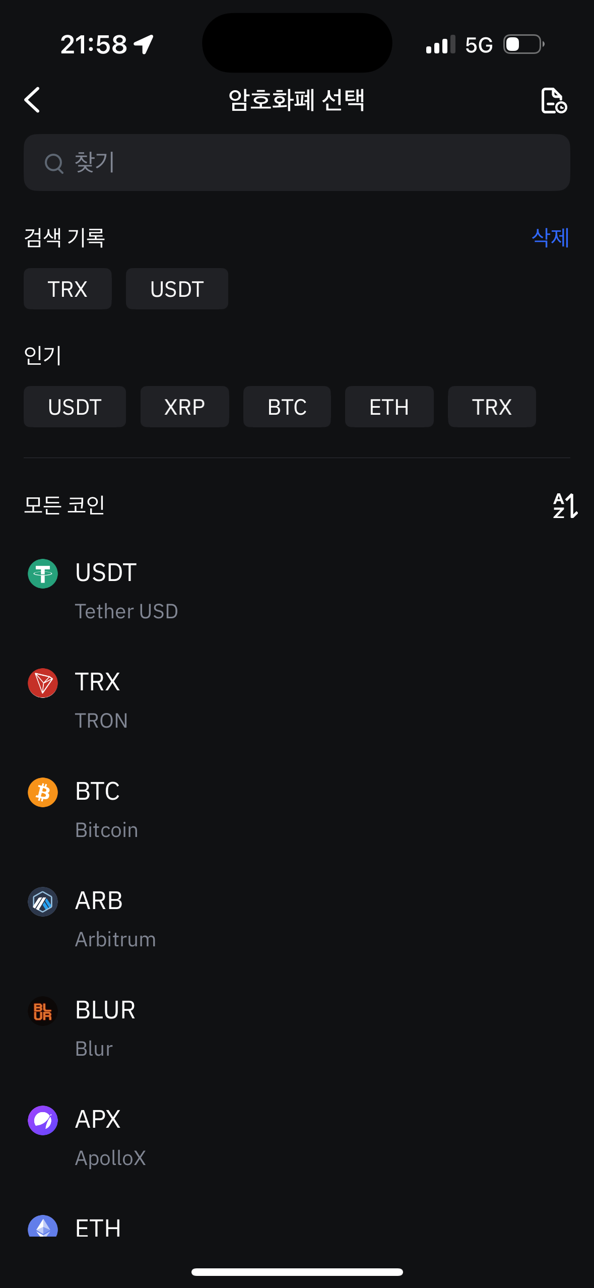 -> 돋보기 클릭 후 "트론 또는 TRX" 검색
